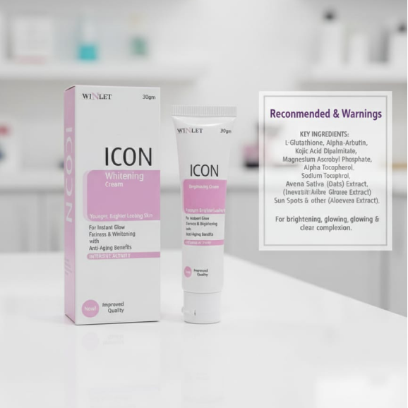 Icon Whitening Cream is a fast-absorbing skincare formula designed to help brighten skin tone, reduce the appearance of dark spots, and promote a smoother, more even complexion. Enriched with skin-nourishing ingredients, it helps restore natural radiance while keeping skin soft and hydrated.